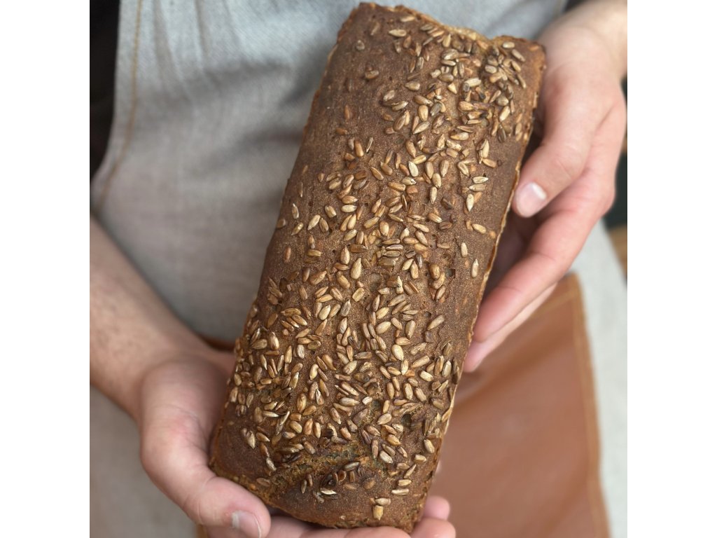 Žitný kváskový chléb vyrobený z hladké žitné mouky, celozrnné žitné mouky, žitného kvásku, slunečnicových semínek, filtrované vody, melasy a soli.
